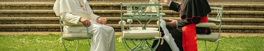 ‘The Two Popes’ draait om het zeldzame moment waarop een paus vrijwillig aftreedt. De gaande en de komende kerkvorst ontmoeten elkaar. De één (Paus met Pensioen Benedictus) is traditioneel-orthodox en niet van zins de kerk te moderniseren. De ander, Bergoglio (de latere Franciscus), heeft een afkeer van pracht en praal en is orthodox-progressief. Gaandeweg gaan ze elkaar meer waarderen. Hopkins slaagt erin een dogmatische Ratzinger milder te maken en Pryce maakt van de tolerante ‘man van het volk’ Bergoglio een zondaar die tot inkeer is gekomen. Een pleidooi voor (mede)menselijkheid.